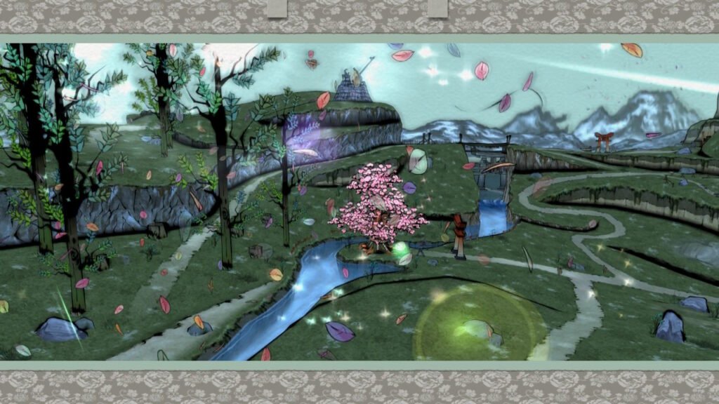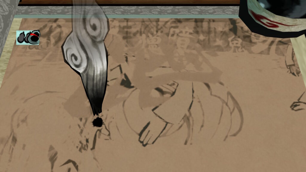 このゲームの特徴は筆調べという、画面上に大きな筆が出現し、壊れた橋を塗りつぶせば復活し、枯れた木をまるく囲めば花が咲くなど筆を駆使して進めていきます。